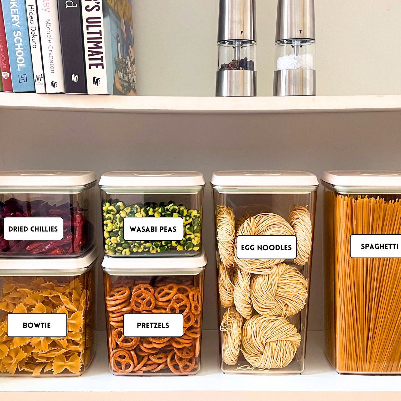 Re-stock essential pantry food items and decant into clear pantry storage containers.