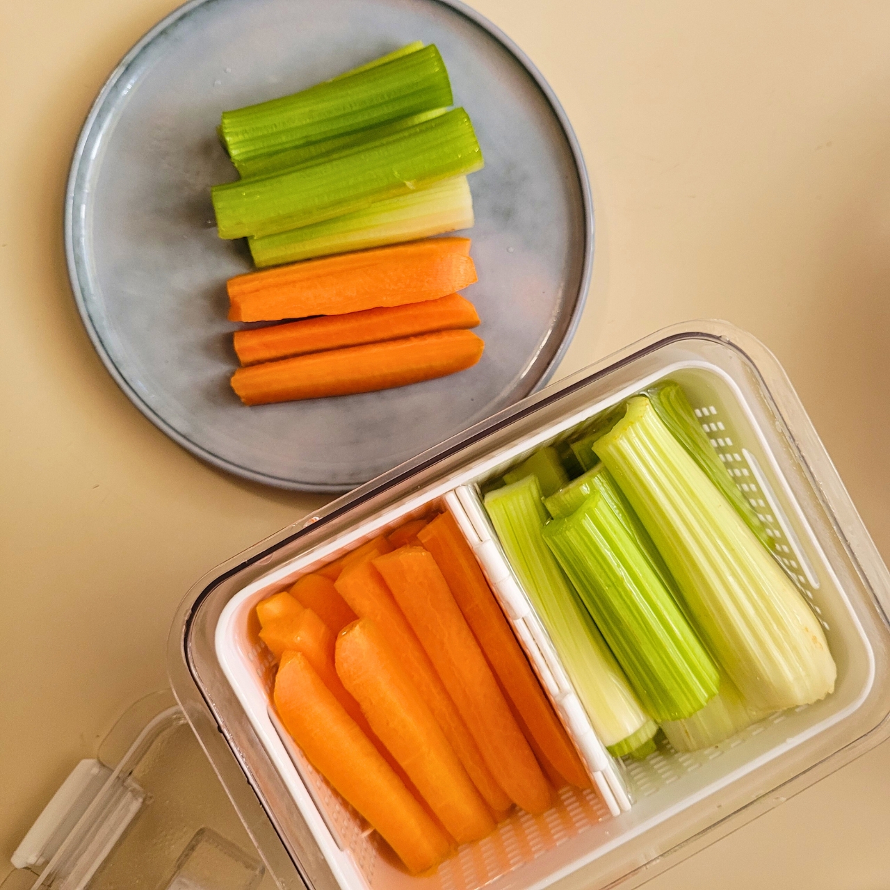 Cut up veggies (carrots and celery) and place them in a fridge container with water to keep them crispy and fresher for longer. Easily grab them whenever you feel like a quick and healthy snack. Remember to change the water every 2 to 3 days to keep them fresh.